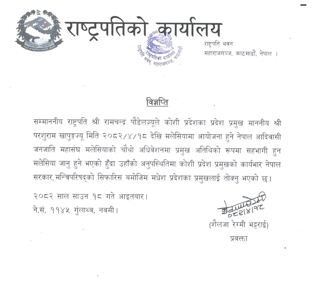 राष्ट्रपतिको कार्यालयले जारी गरेको विज्ञप्तिमा भनिएको छ, “कोशी प्रदेशका माननीय प्रमुख श्री परशुराम खापुङ मलेसियामा आयोजना हुने नेपाल आदिवासी जनजाति महासंघको चौथो अधिवेशनमा प्रमुख अतिथिका रूपमा सहभागी हुन जाने भएकाले उहाँको अनुपस्थितिमा मधेस प्रदेशकी माननीय प्रमुख सुमित्रा सुवेदी भण्डारीलाई कार्यवाहक जिम्मेवारी तोकिएको छ।”
