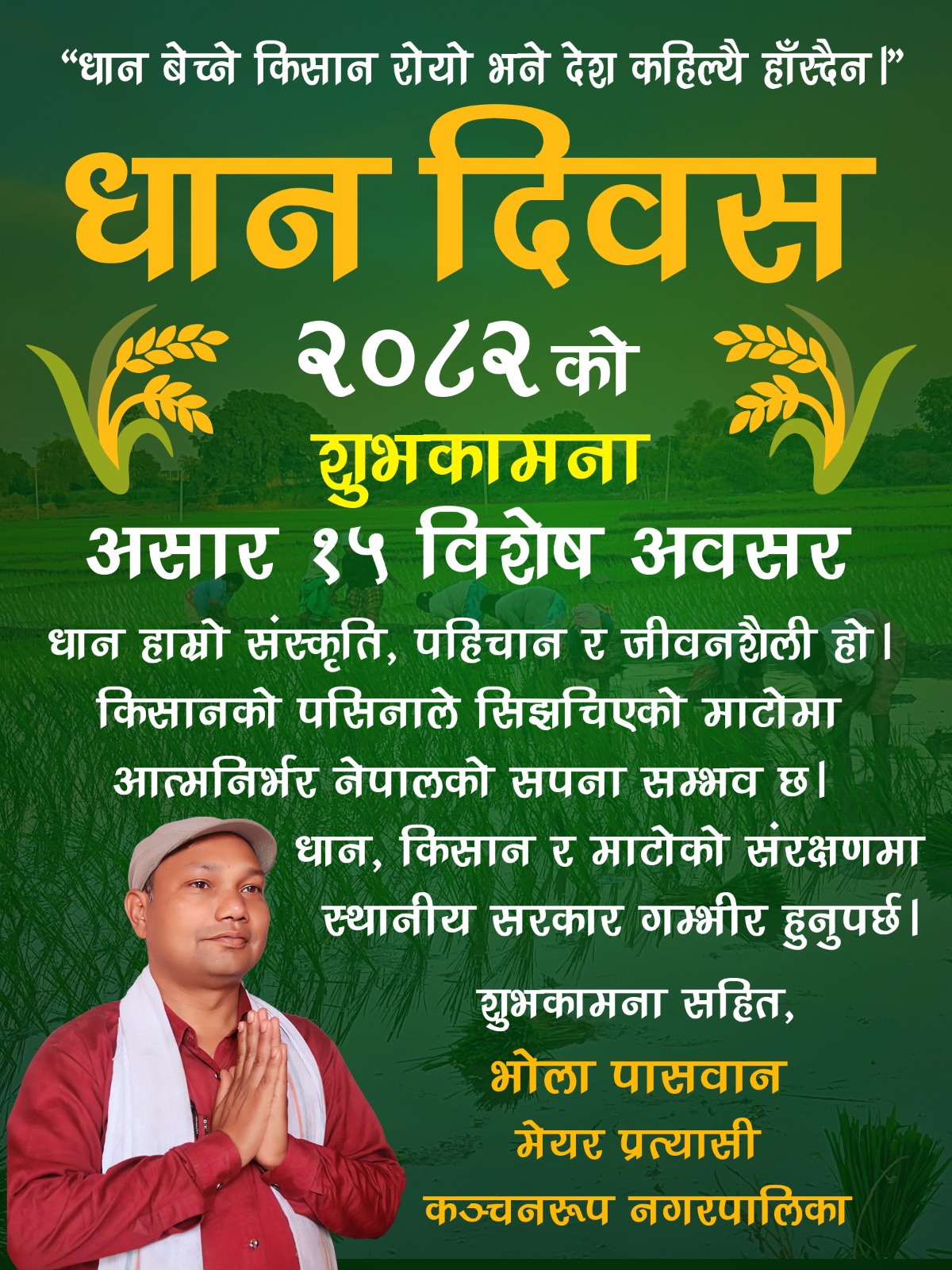 कञ्चनरुप (सप्तरी), १५ असार । राष्ट्रिय धान दिवसको अवसरमा कञ्चनरुप नगरपालिकाका मेयर पदका प्रत्यासी तथा सामाजिक अभियन्ता भोला पासवानले किसानको समस्यामाथि राज्यको गम्भीर उदासिनताप्रति आक्रोश व्यक्त गरेकाे हाे ।