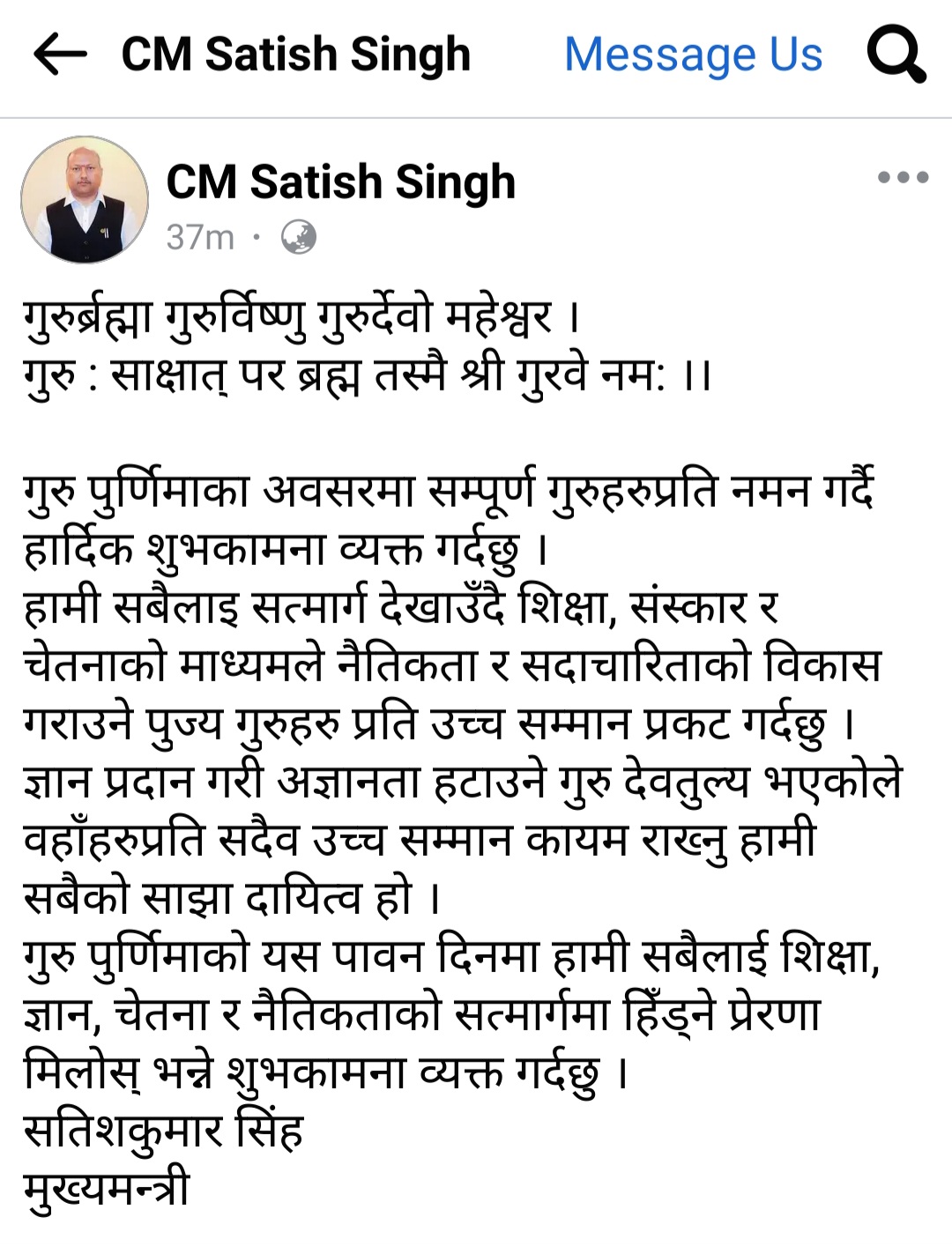 गुरु पुर्णिमाकाे मुख्यमन्त्री सिंहद्वारा आज सामाजिक सञ्जालमा शुभकामना सन्देश
