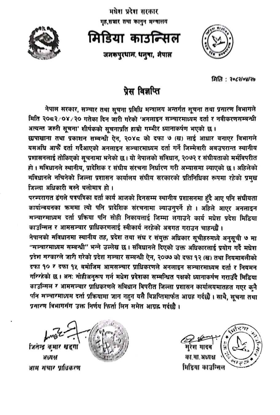 मंगलबार आम सञ्चार प्राधिकरणका मधेश प्रदेशका अध्यक्ष जितेन्द्र कुमार खड्गा र मिडिया काउन्सिलका कार्यवाहक अध्यक्ष सुरेश यादवले संयुक्त विज्ञप्ति जारी गर्दै सूचना तथा प्रसारण विभागले साउन २० गते सार्वजनिक गरेको ‘अनलाइन सञ्चारमाध्यम दर्ता र नवीकरणसम्बन्धी अत्यन्त जरुरी सूचना’ संविधान र संघीयताको भावनाविपरीत भएको बताएकाे हाे।