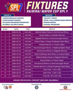 राजविराज (सप्तरी), २४ असार । नेपाल क्रिकेट संघ (क्यान) को निर्देशनमा आयोजना हुने सप्तरी प्रिमियर लिग (एसपीएल) अन्तर्गतको ‘राजविराज मेयर कप पुरुष क्रिकेट लिग–सिजन ७’ प्रतियोगिता आगामी असार २६ गतेदेखि सुरु हुने भएको छ ।